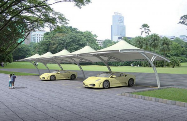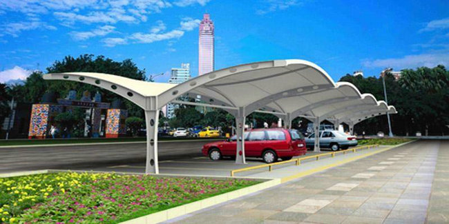 膜結(jié)構(gòu)停車(chē)棚以一種類似帳篷、充滿柔性的建筑越來(lái)越多地出現(xiàn)在城市廣場(chǎng)、公園邊上,以其優(yōu)美的曲線吸引了大眾的目光,其造型自由輕巧、阻燃、制作簡(jiǎn)易、安裝便捷、節(jié)能、易于使用。作為一種特殊的現(xiàn)代建筑結(jié)構(gòu),以高強(qiáng)度柔韌性薄膜材料與張拉體系相結(jié)合,形成的具有一定剛度的空間結(jié)構(gòu)體。